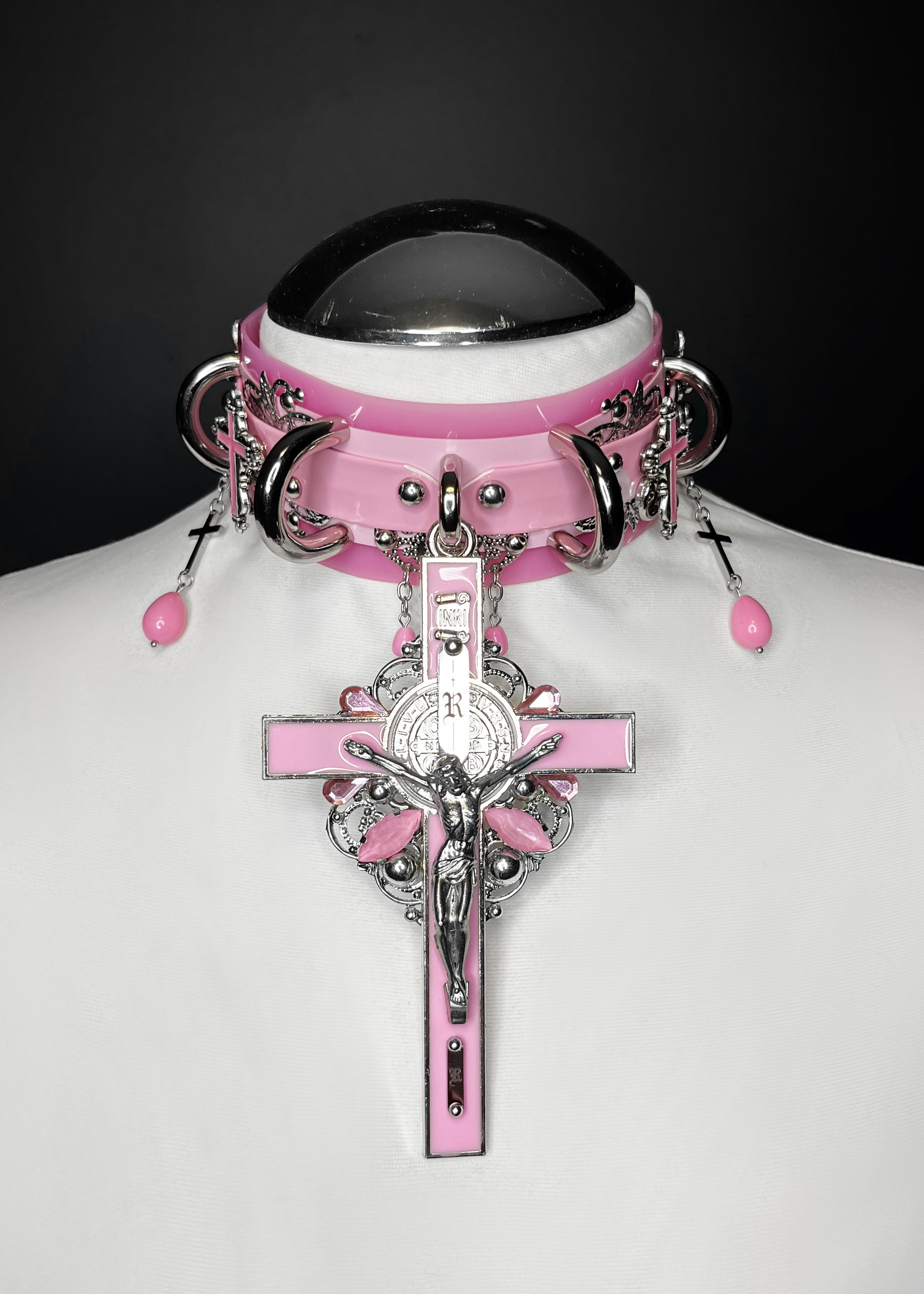 A favorite design now available in slick, full PVC make. This one is a pink edition of the PVC Holy Black Mass choker, featuring 3 shades of pink PVC.