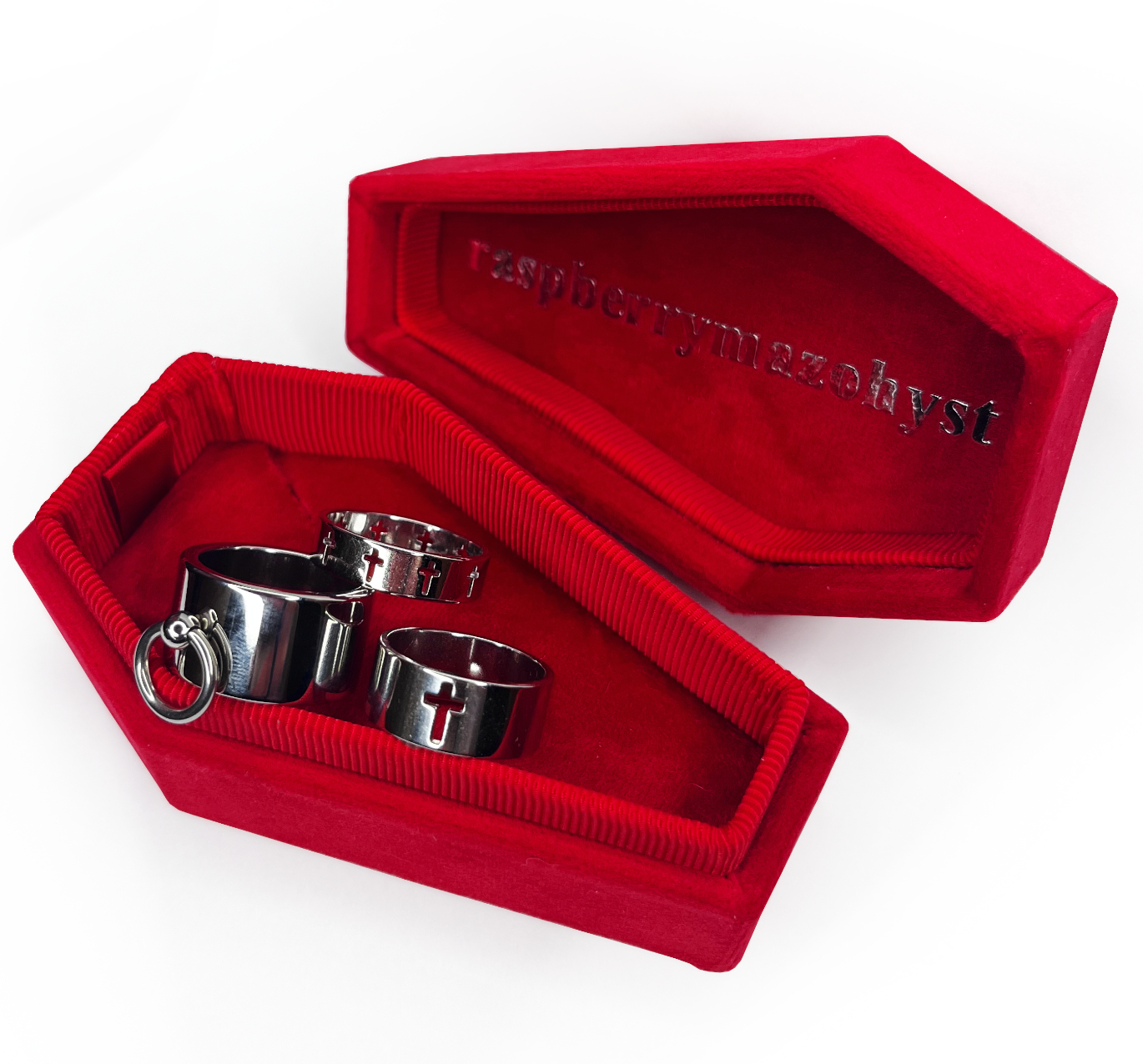 A slick steel ring for the lovers of cool but subdued jewels! Decorated with laser cut silhouettes of crosses on a slim band.