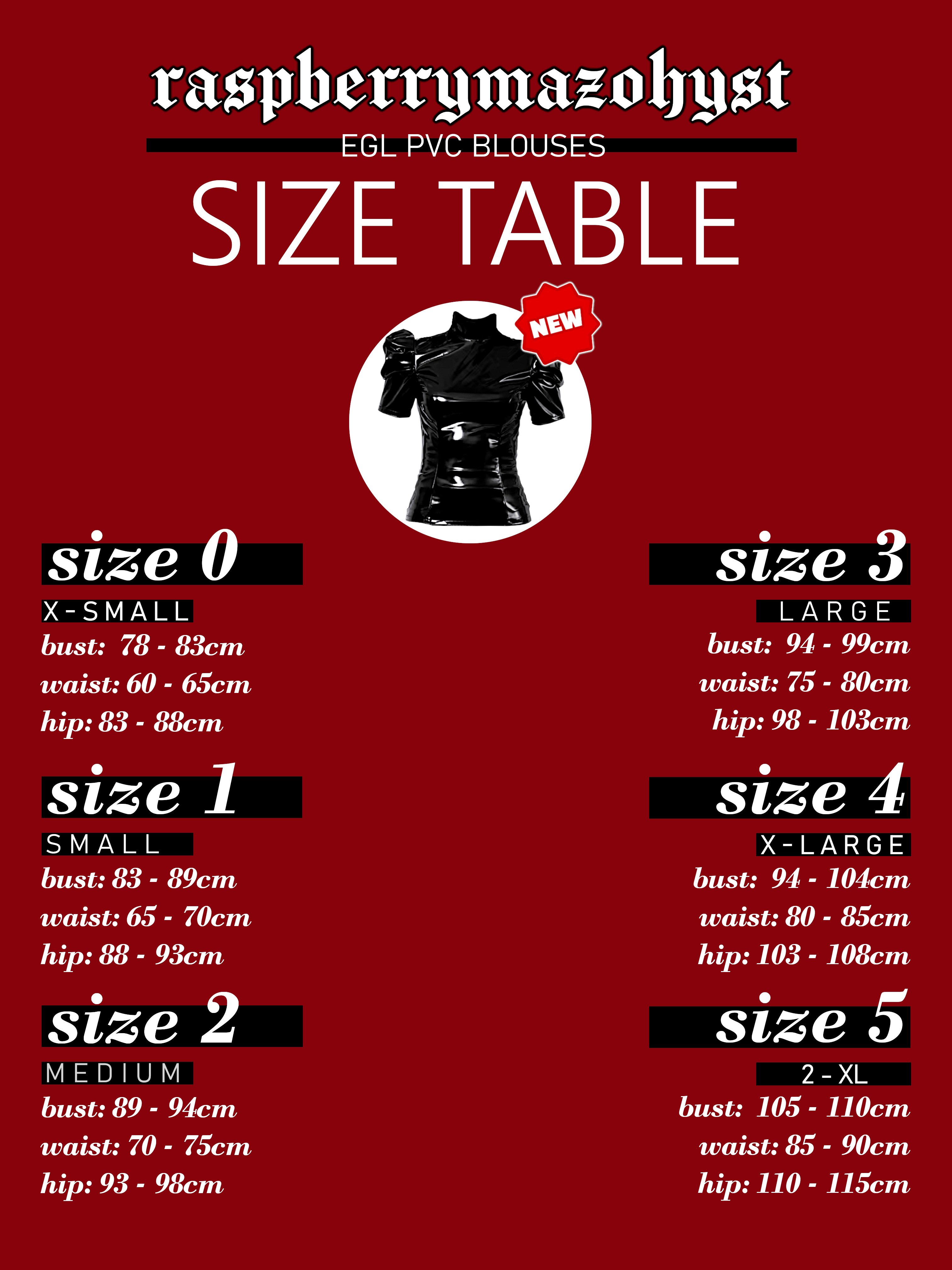 SAFETY TIPS & DISCLAIMER: PVC is a one-sided fabric, where the top side is a vinyl polychloride coating, and the bottom side has a classic fabric feel and structure. PVC is a stretchy fabric, however it is important to choose a correct size to ensure a perfect fit, and prevent fabric degradation due to overstretch. PVC is not a very breathable fabric - in case of skin sensitivities it is recommended to wear a garment underneath. Discontinue wear if any redness or irritation occurs. THE BLOUSE IN ITS NEWNESS DOES COME WITH A SMELL, which is just the specificity of the fabric. Upon purchasing be sure to hang the blouse to air it out. Keep all PVC garments separated by colors, and separately from other similar fabrics.