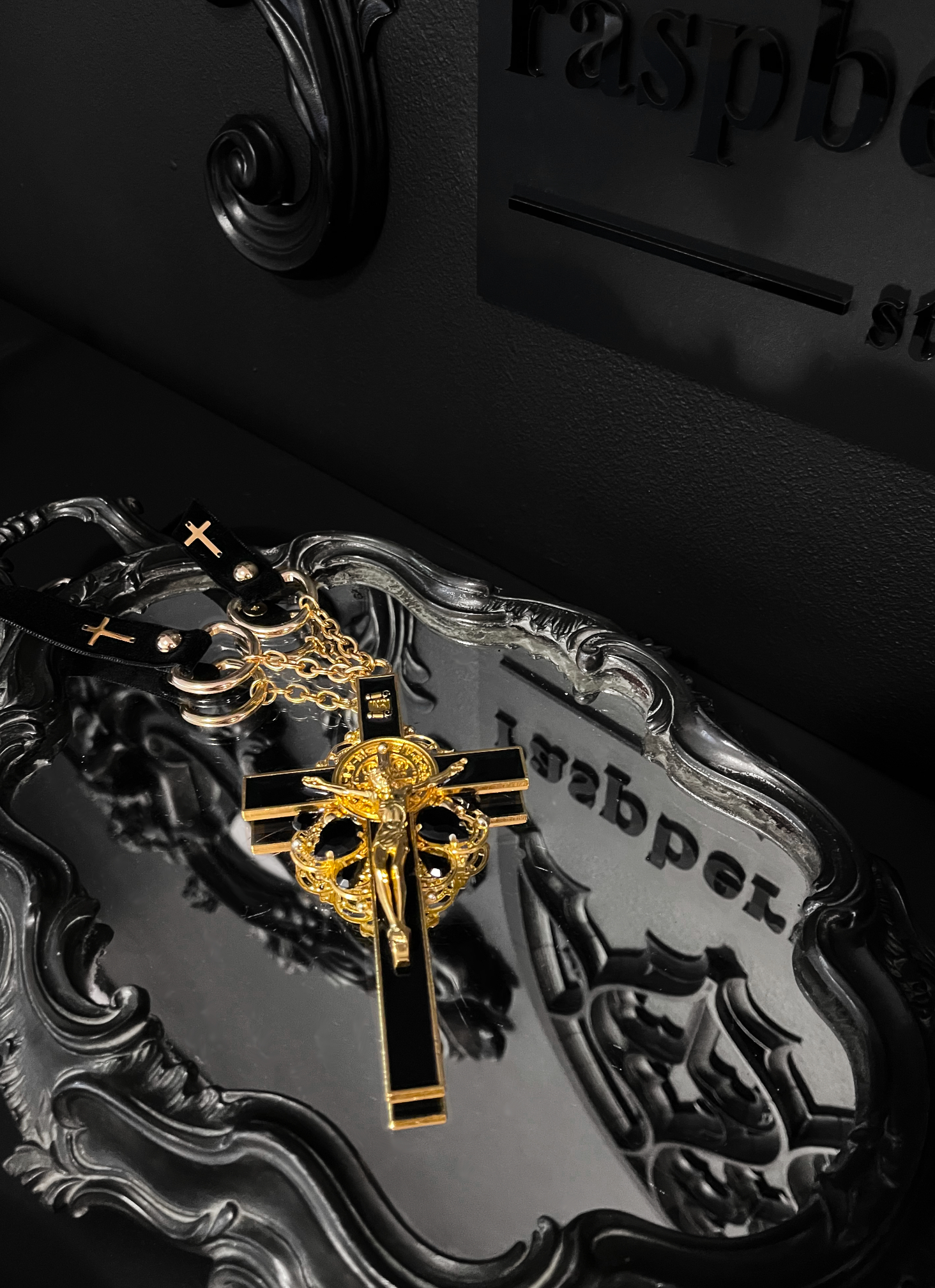Holy Black Mass necklaces available in all 5 colors: Black, red, blue, pink, and white. This is A GOLD HARDWARE VERSION. Please see a separate listing for a silver version.